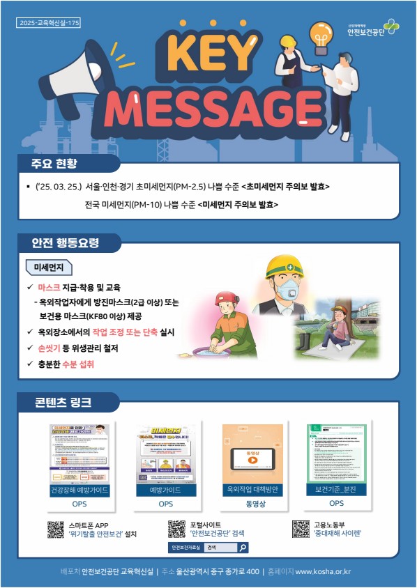 안전보건공단 안전보건자료실에 [KEY MESSAGE 3호 미세먼지]가 게시되었습니다.